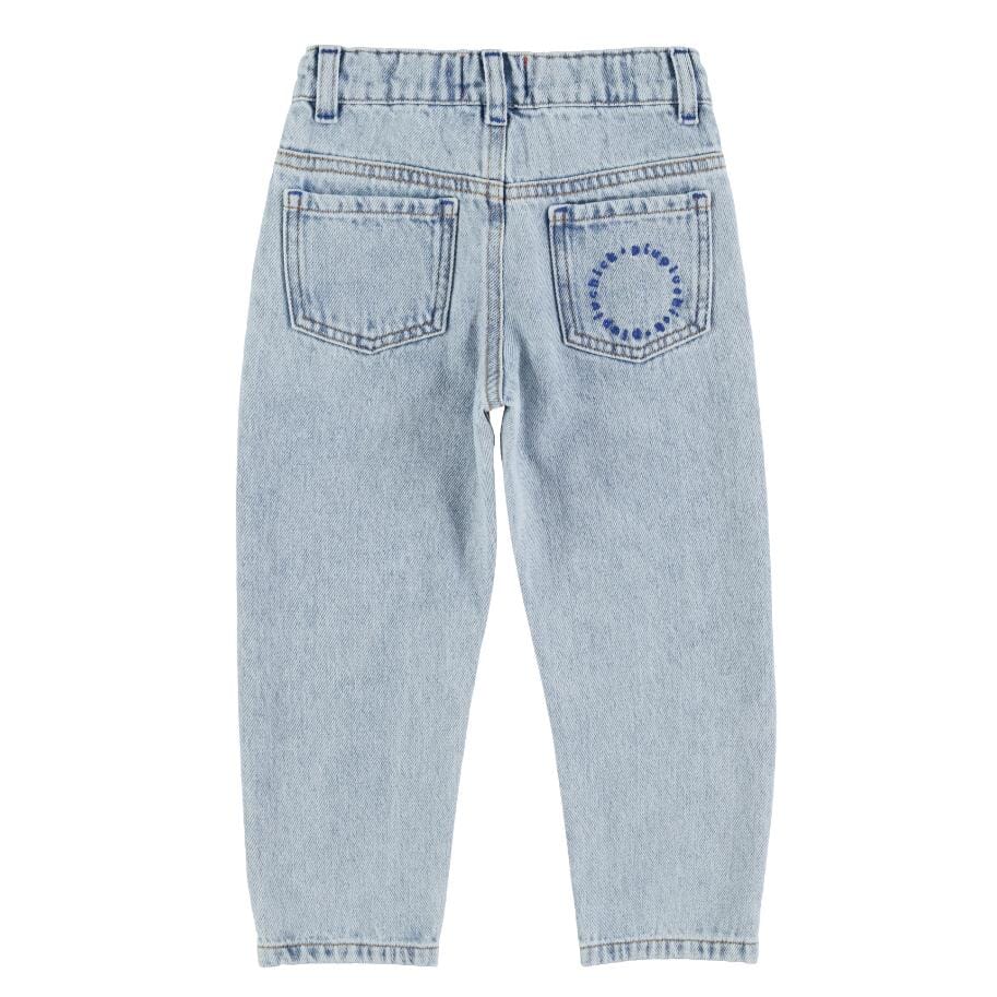 Unisex jeansbroek in de kleur Washed blue denim van Piupiuchick. Deze broek met verstelbare tailleband heeft het logo van Piupiuchick geborduurd op een van de achterzakken.